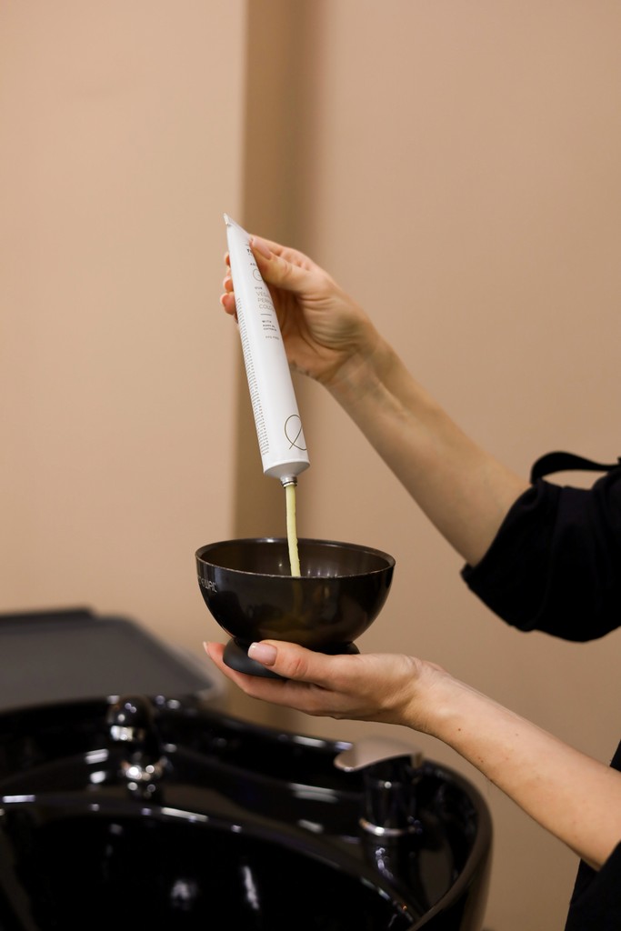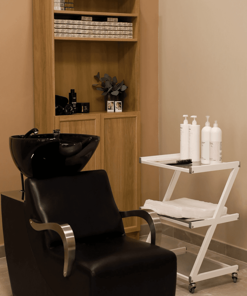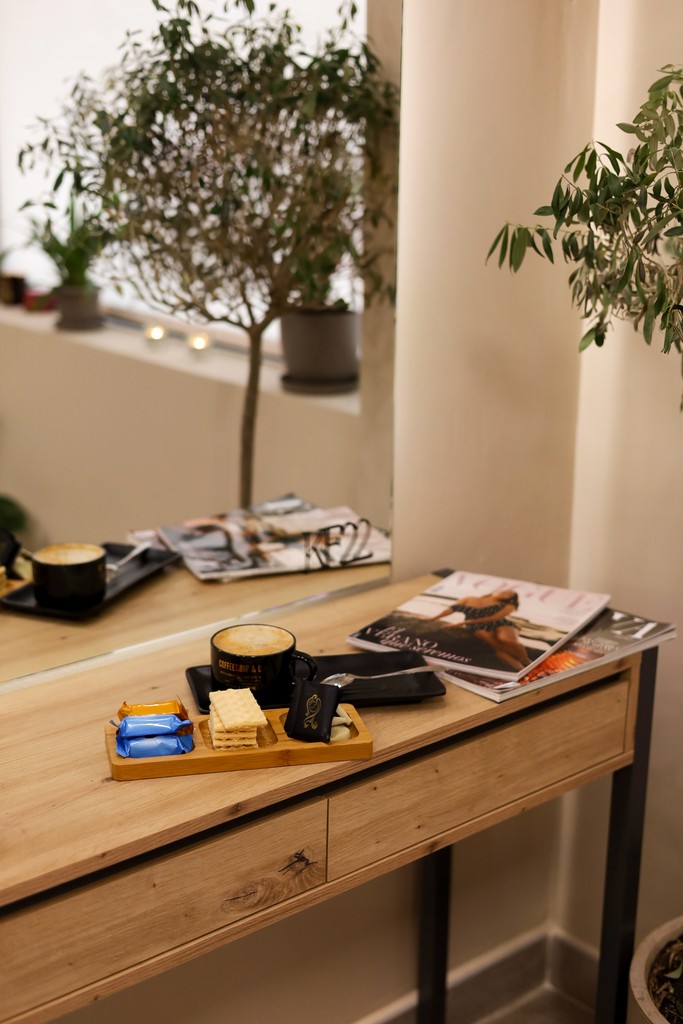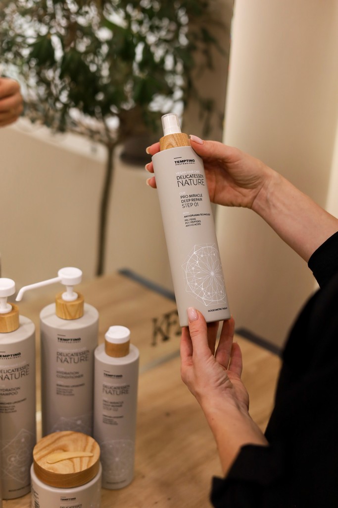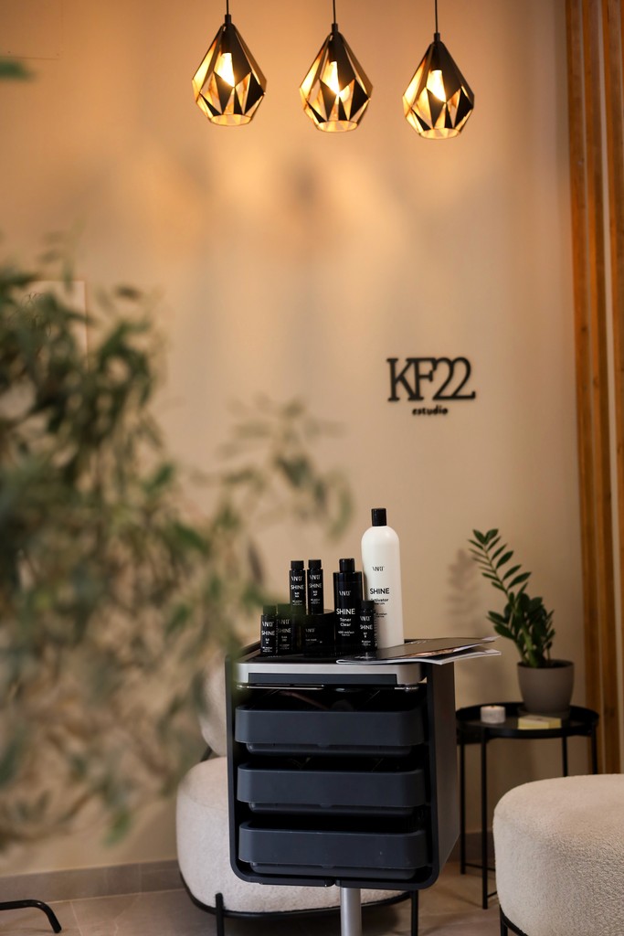 The interior of KF22 was created to translate the brand’s identity into a physical experience defined by calm and precision. Walls in the signature palette and natural materials such as wood, stone, and graphite form a refined, welcoming atmosphere. The layout was designed to ensure comfort for clients and efficiency for specialists. A dedicated photo corner encourages visitors to share their experience, while subtle branded elements like mirror lettering and olive tree décor strengthen recognition and create a sense of continuity throughout the space.